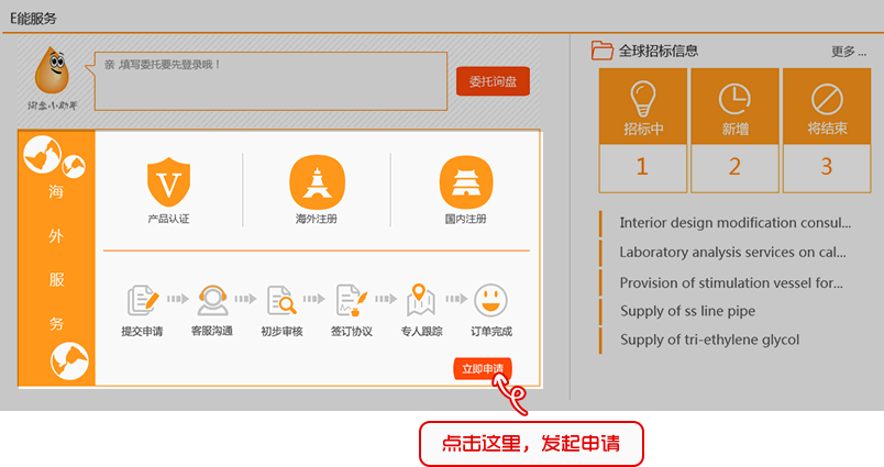 认证通过的企业用户,登录后在首页->E能服务中申请海外服务
