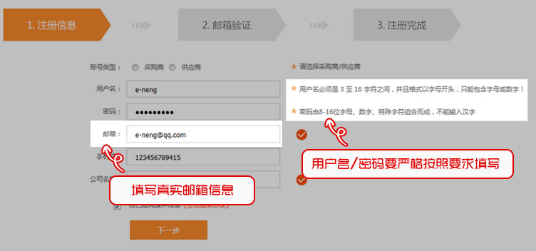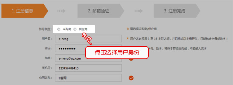 完成此步骤即成功注册了E能网专属账号,用户获得浏览E能网大部分信息的资格,但不能在E能网上发布产品和采购产品;